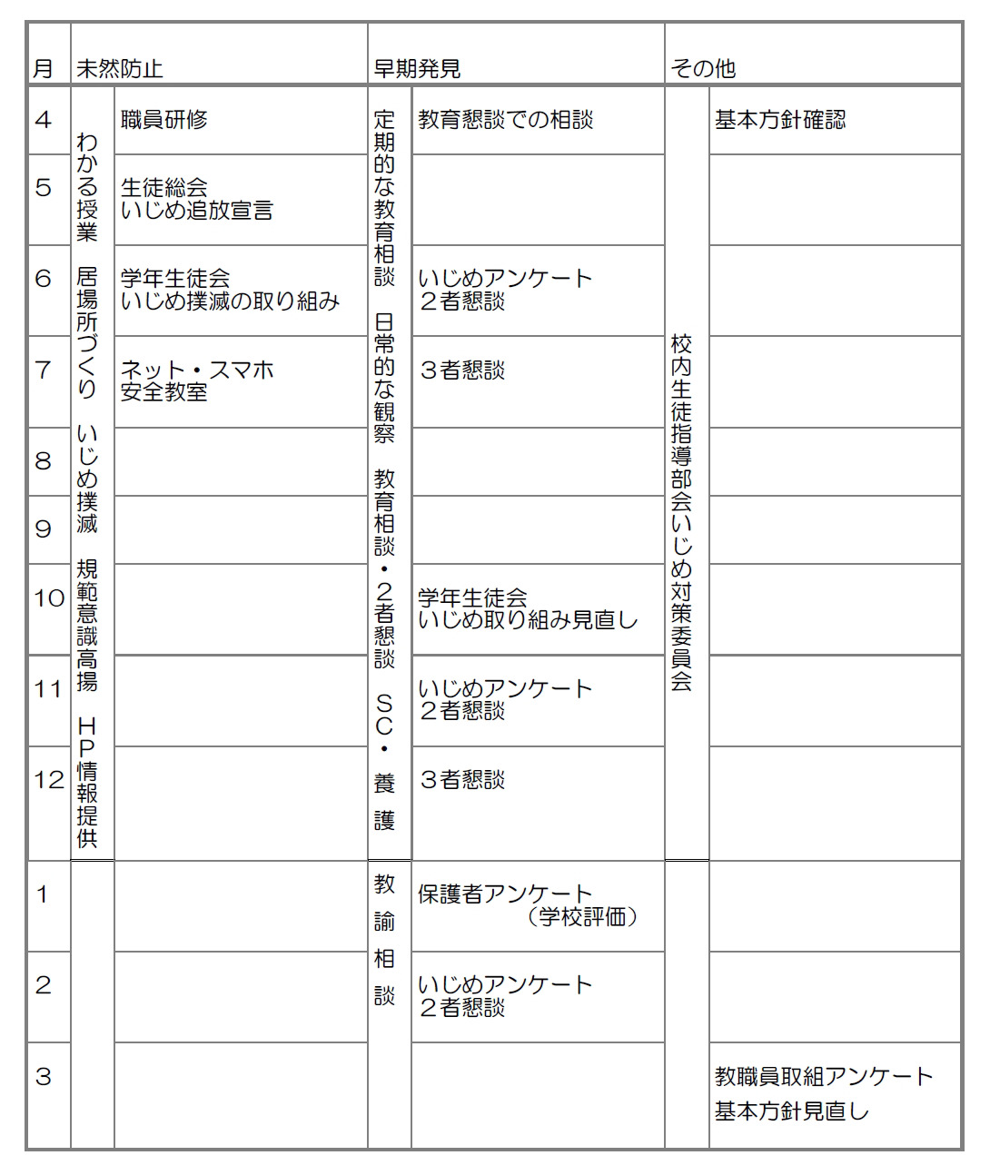 - 全校体制での「いじめ学習会」実施 生徒会活動における「いじめ防止集会」の開催