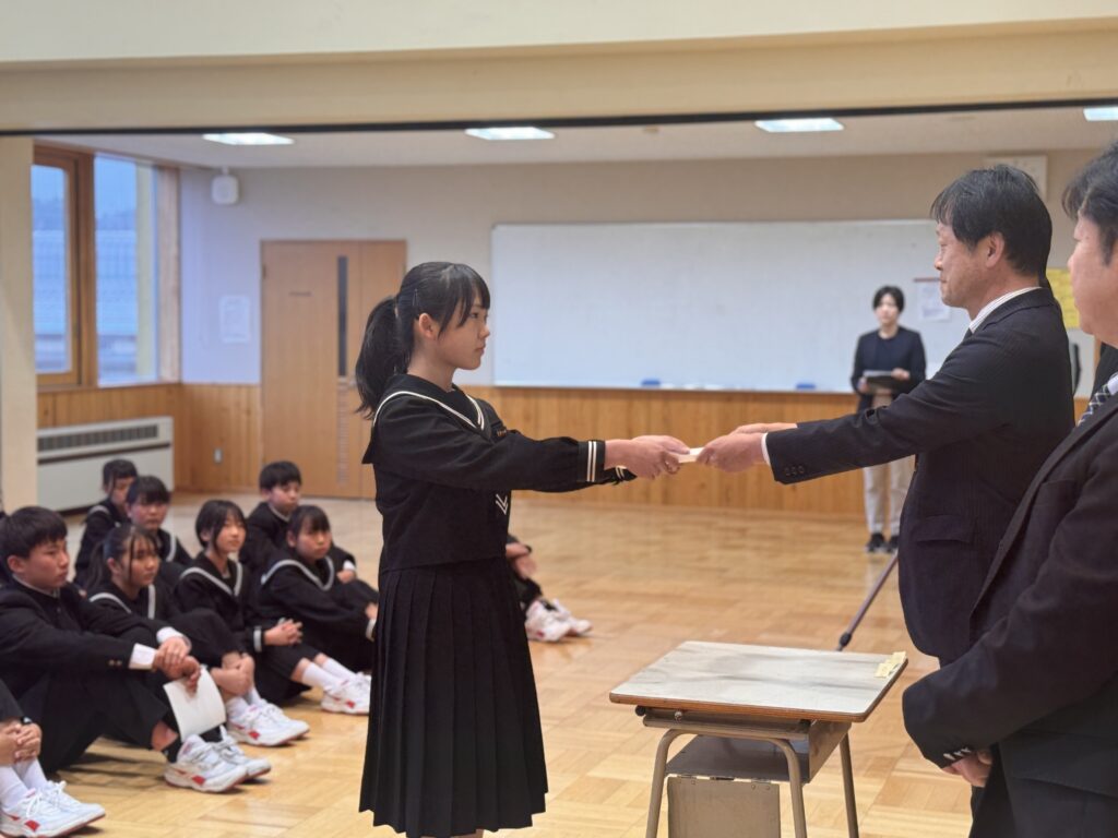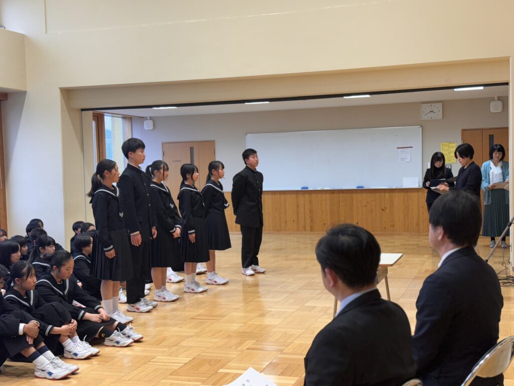 5月2日(金)前期学級役員認証式 投稿日 2025年5月2日 著者 webmaster カテゴリー 新着情報 前期学級役員の認証式を行いました。 全校にはその様子がリモートで中継されました。 学級役員となった生徒たちは意識も高く、大きな声で返事をしていました。 とても立派な様子でした。各クラスの中心となりがんばっていくことを期待したいと思います。